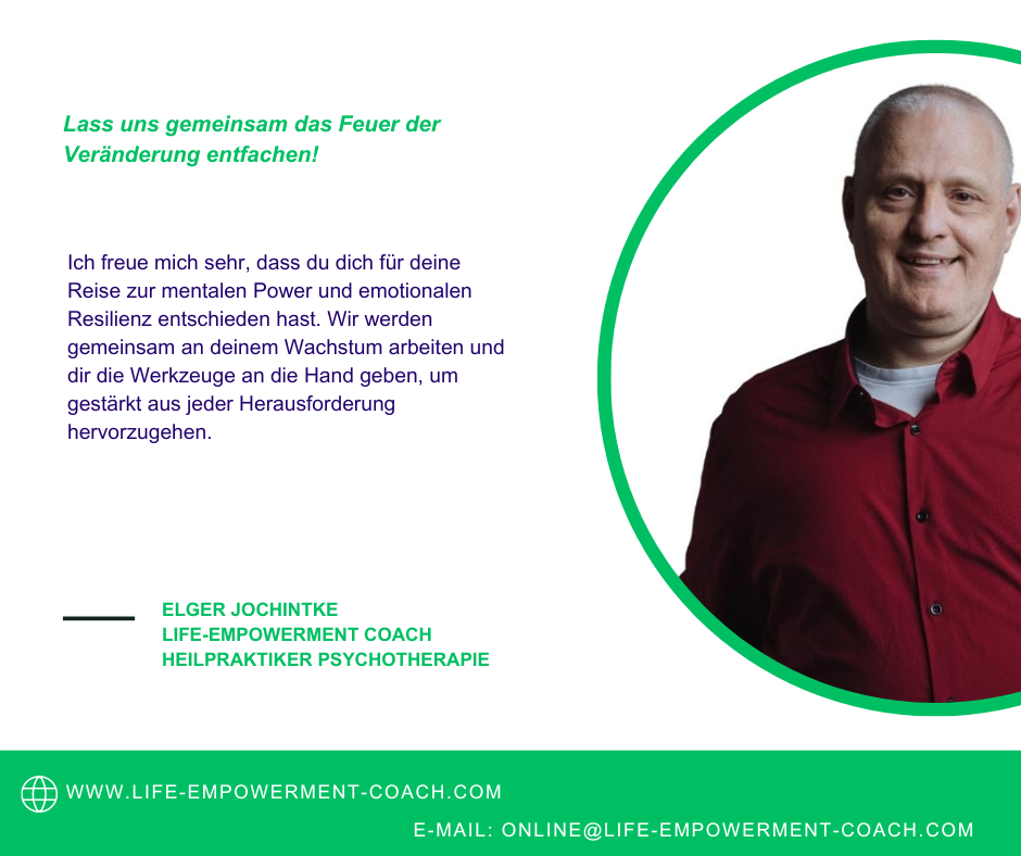 Ich biete dir nicht nur irgend eine Dienstleistung, sondern sie ist individuell auf dich zugeschnitten. Du bekommst nicht nur Werkzeuge zur Bewältigung deiner Krise - du wirst auch die Inspiration finden, um deine innere Flamme wieder zum Brennen zu bringen. In dem Lächeln, das du wiederfindest, liegt der Sieg über deine Ängste. Wenn du auf der Suche nach Unterstützung bei deinen persönlichen Herausforderungen bist, lade ich dich herzlich ein, mich zu kontaktieren und einen vertraulichen Termin für ein unverbindliches Erstgespräch zu vereinbaren.